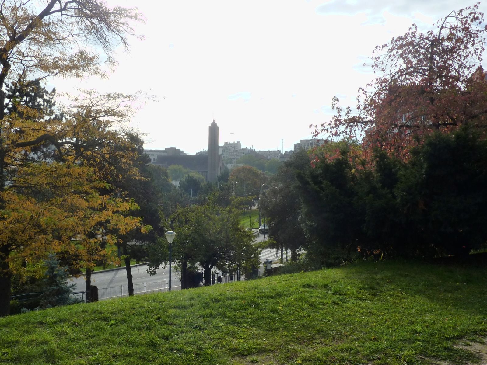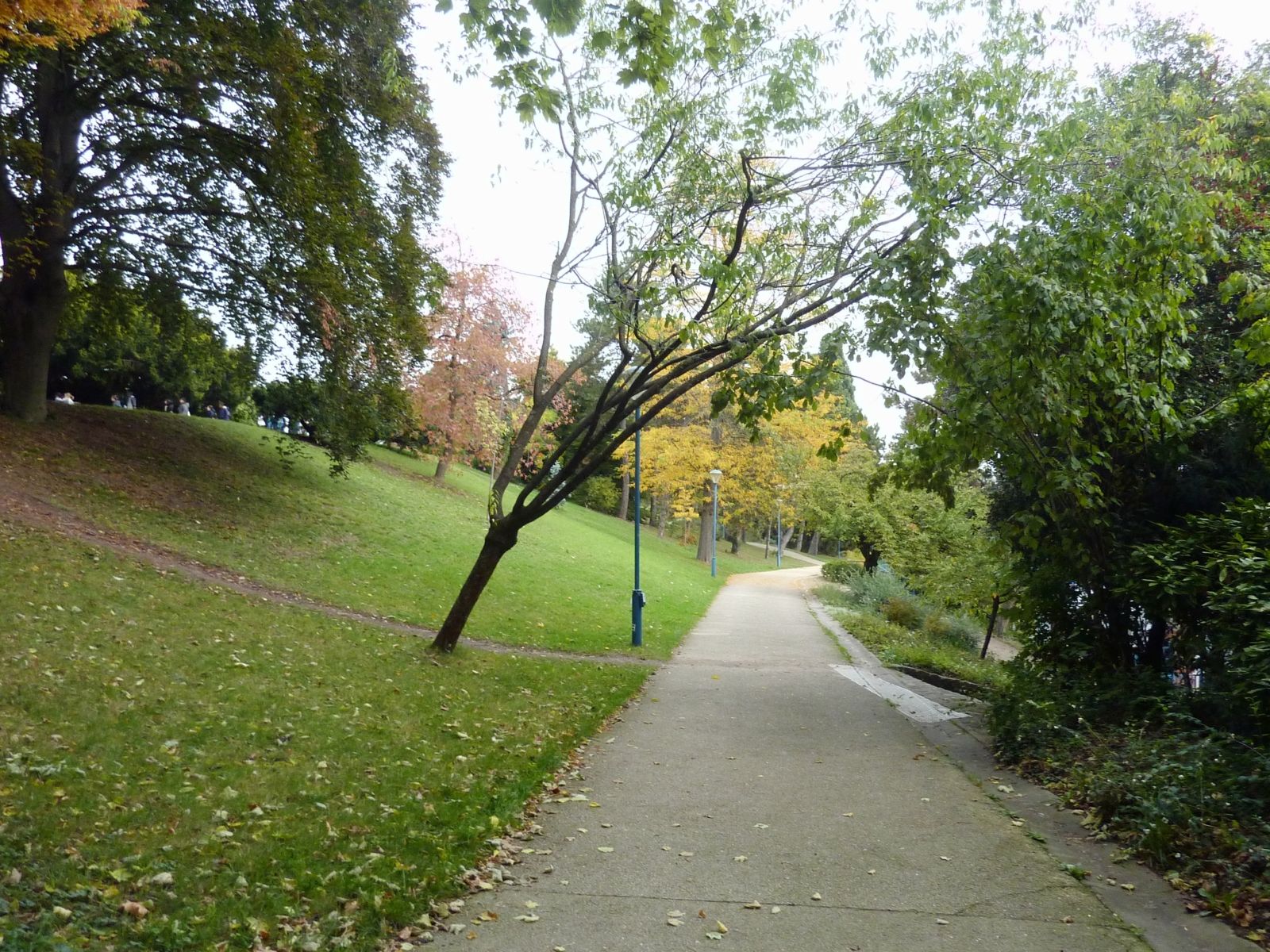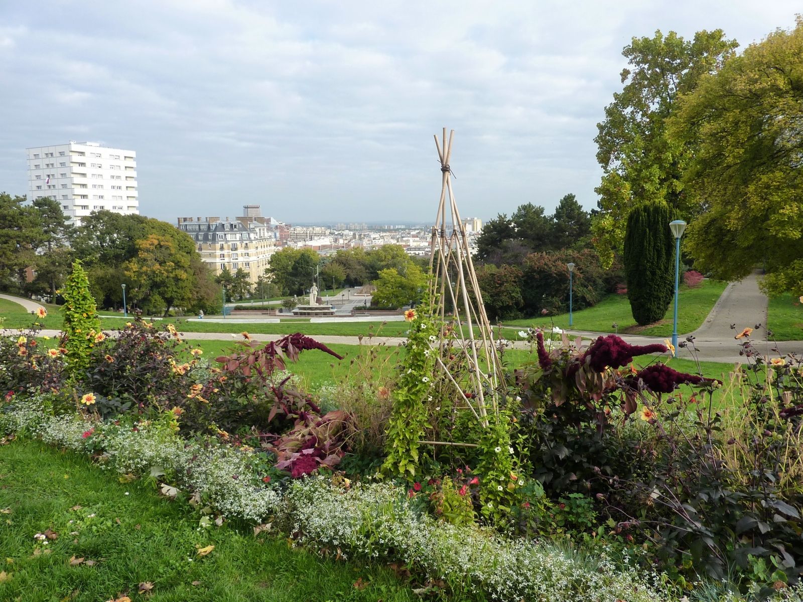 Depuis le haut du parc on jouit d'une très belle vue sur le Pré Saint-Gervais, cette commune de banlieue située de l'autre côté du périphérique.