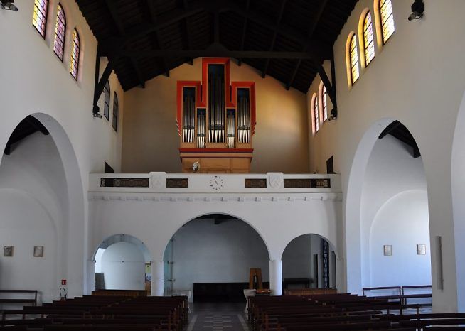 De l'autre côté de l'église, au-dessus du narthex, le balcon de style art-déco orné de fer forgé et d'une petite horloge supporte l'orgue de tribune qui était dû à Rochesson (1951). Il a été remplacé en 2007 par le facteur d'orgue Bernard Cogez. Moderne, il s'harmonise très bien avec la sobriété de l'église.