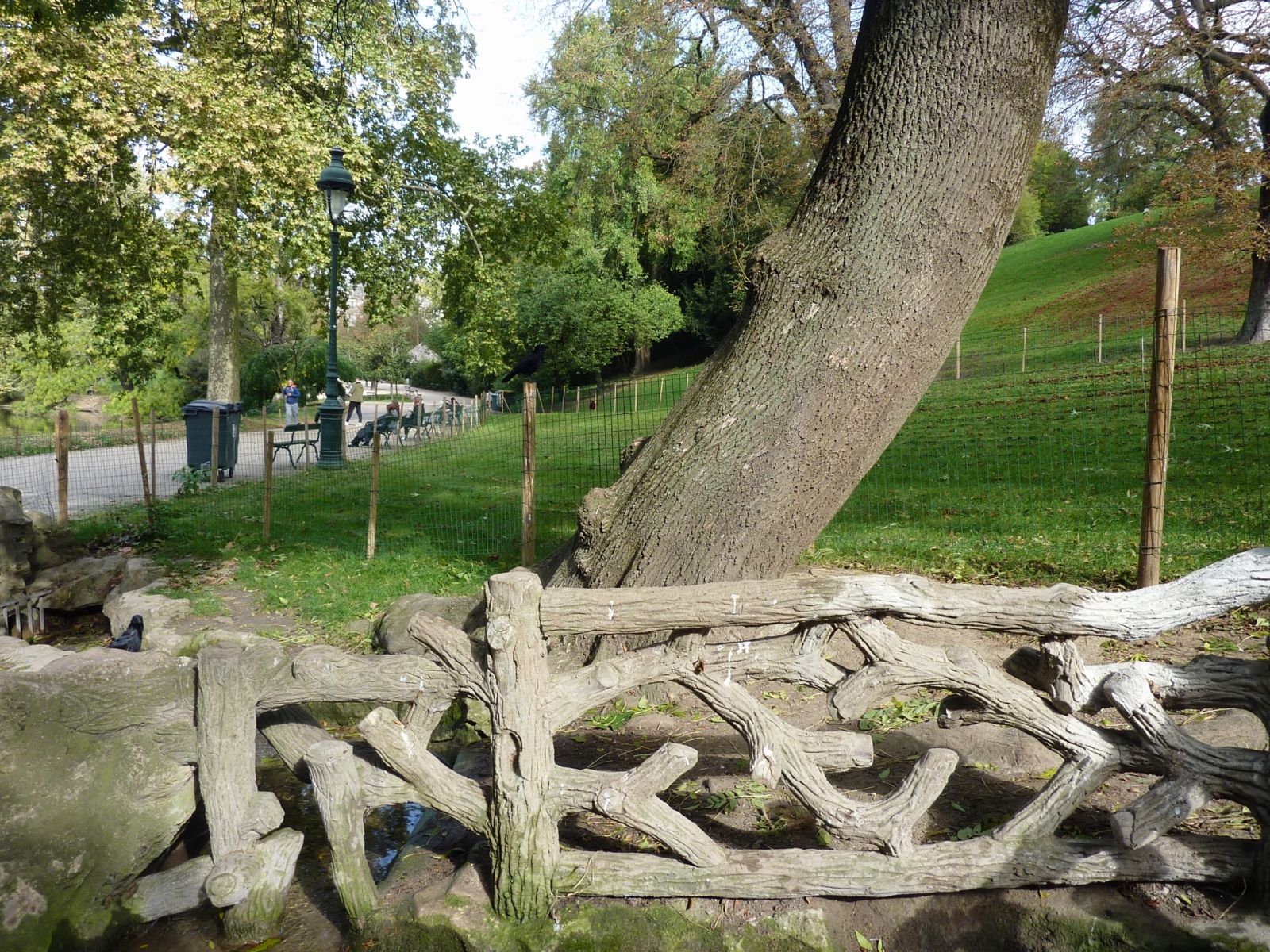 Un peu plus loin, on peut voir les barrières en béton strié imitant le bois, caractéristiques de tous les parcs Haussmanniens de Paris.