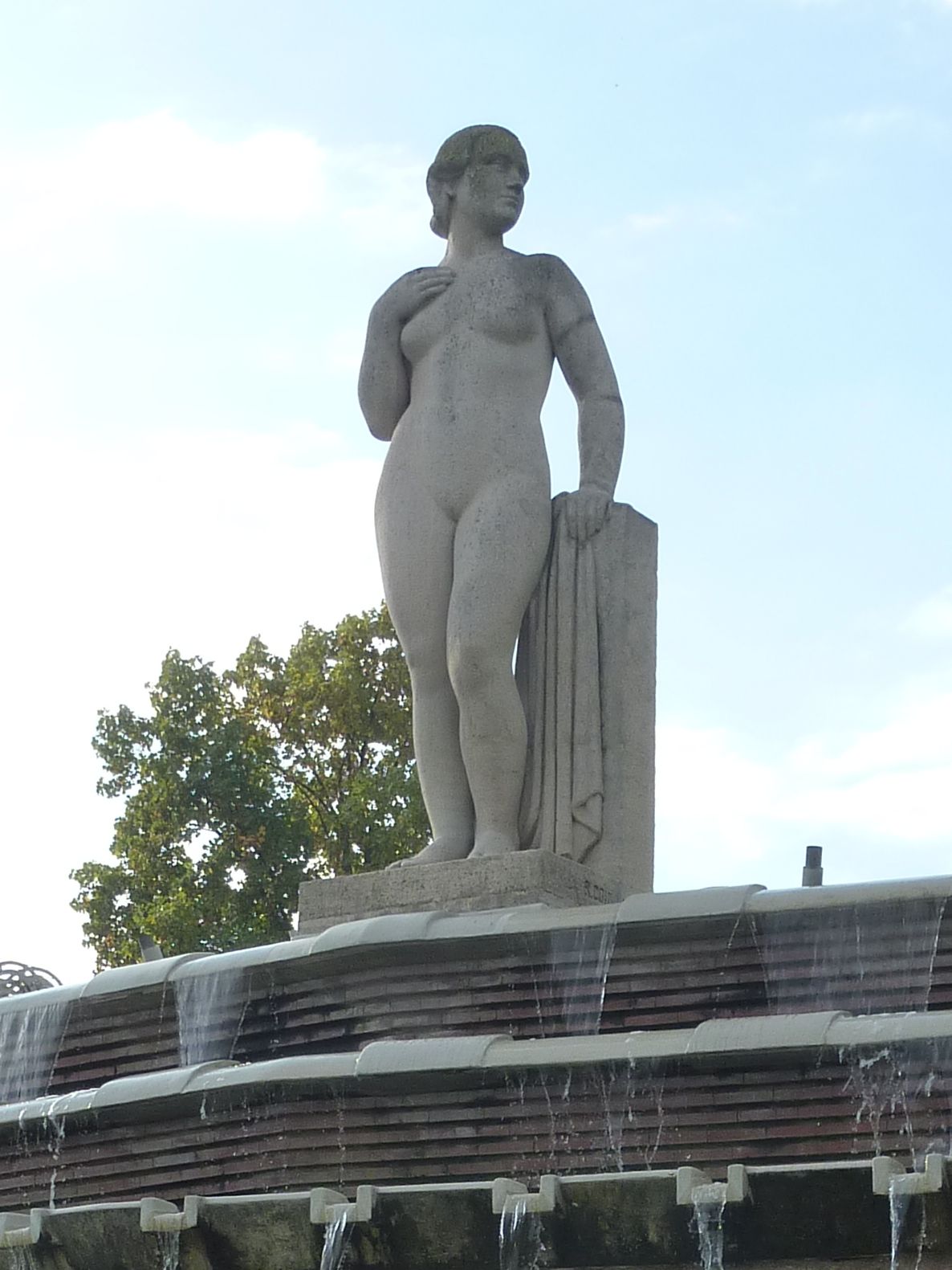 En bas des marches, une fontaine monumentale surmontée d'une statue d'Eve (1938) par Raymond Couvègnes (1938)