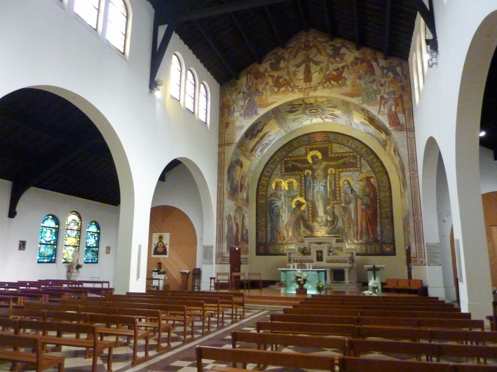 La charpente est en béton armé imitant le bois : vous pouvez l'apercevoir en haut de cette photo de la nef : cela fait un vrai contraste avec la blancheur des murs. Le chœur est superbe de sobriété mettant bien en exergue l'immense fresque en mosaïques de style byzantin réalisée par la maison Mauméjean, maîtres verriers et mosaïstes depuis trois générations.