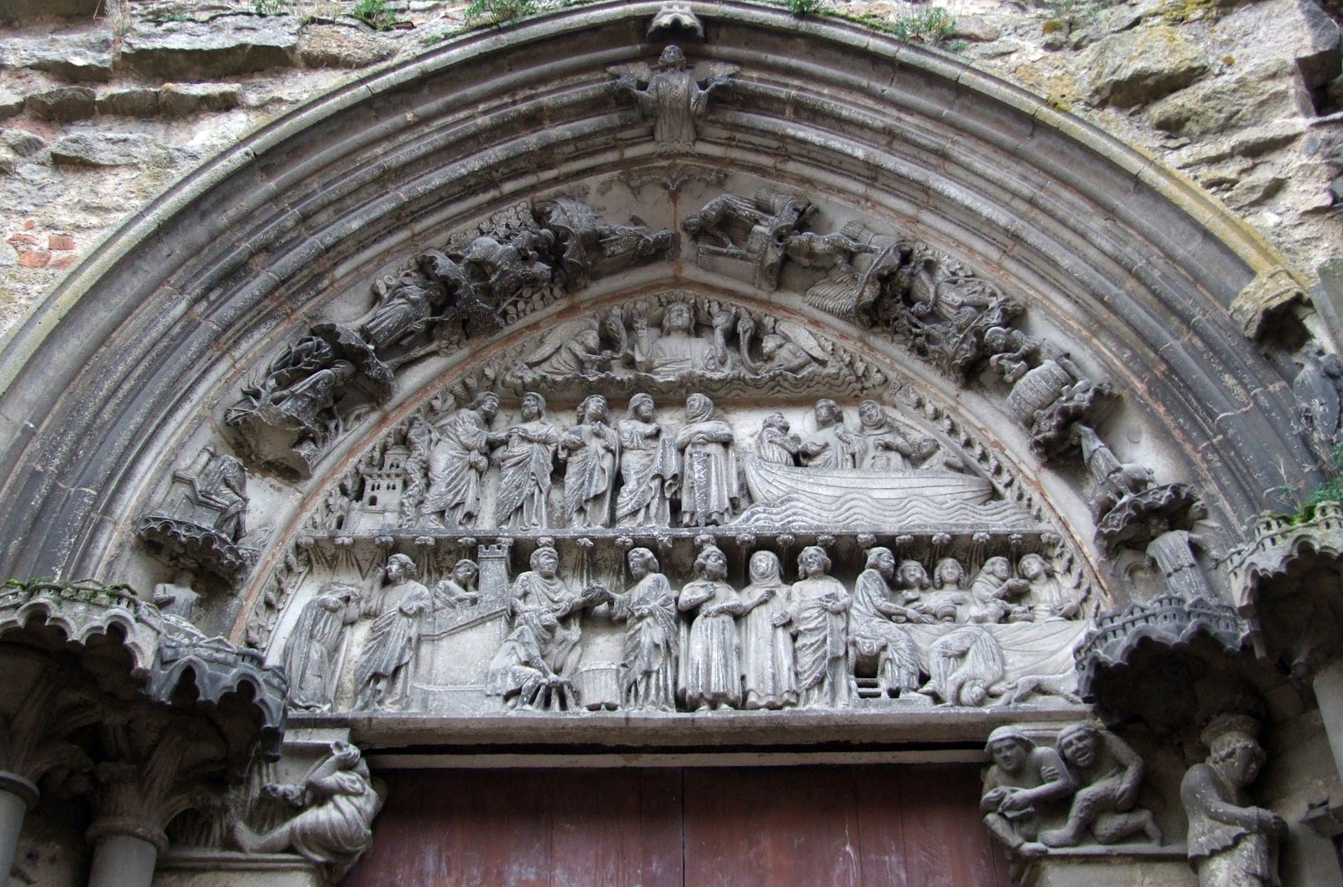 On peut remarquer plusieurs personnages profanes en haut des colonnettes qui supportent le tympan.