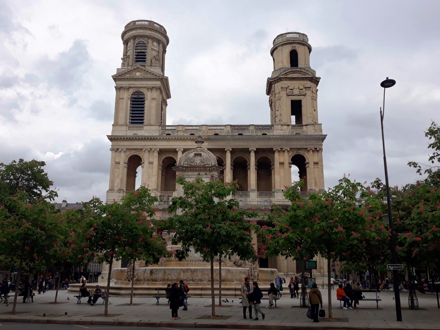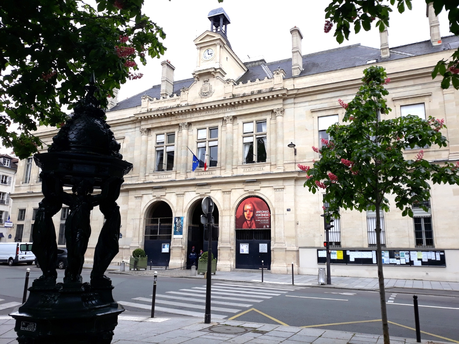 La mairie du 6e arrondissement se trouve sur la place Saint-Sulpice juste en face de l'église et de la fontaine du même nom, alimentée en eau en ce début de printemps pour le plus grand plaisir des passants qui passent, comme dirait Jacques Prévert.