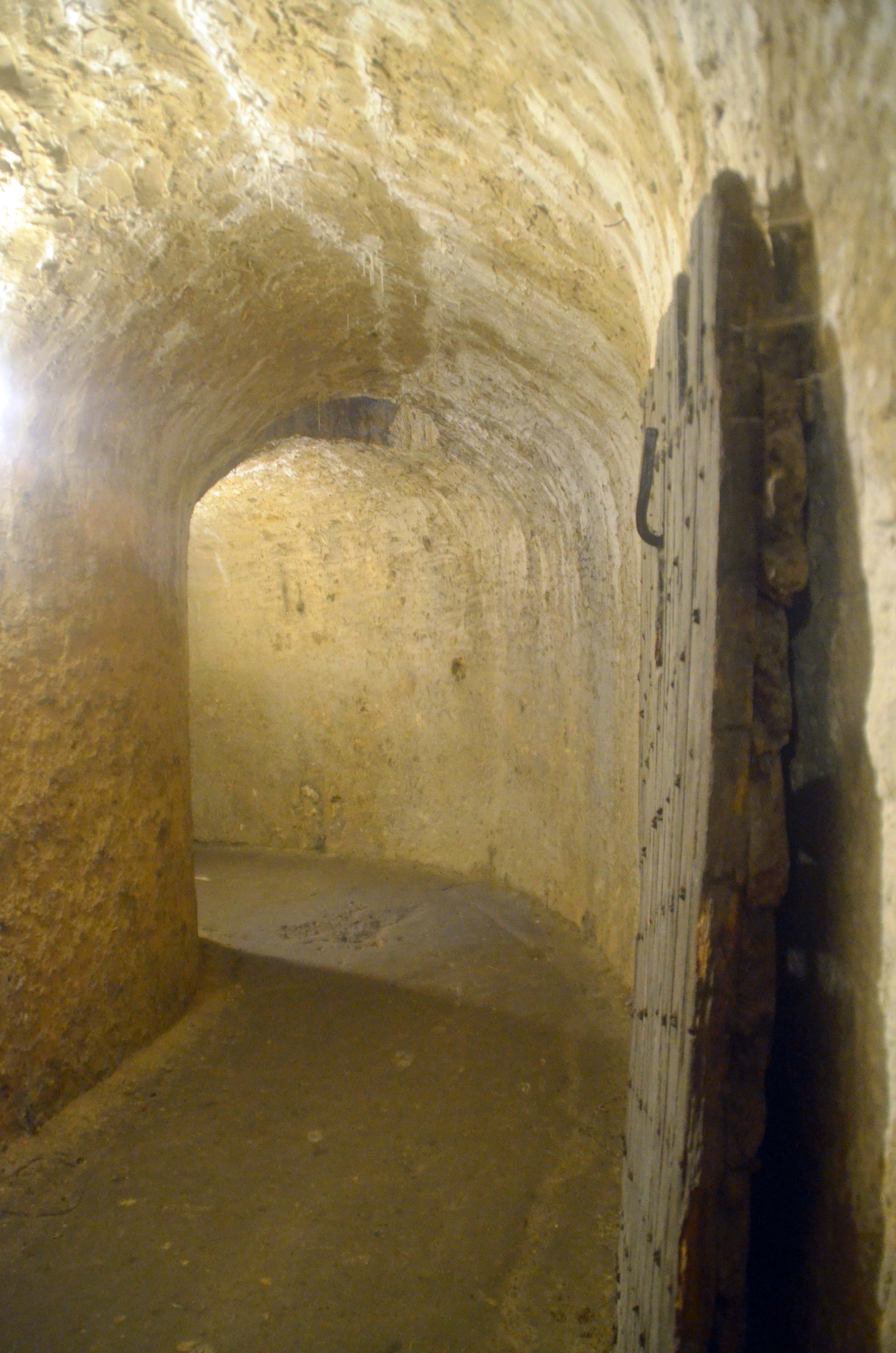 C'est par une porte, bien cachée derrière ce refend de fortification, que nous allons accéder à notre premier souterrain.